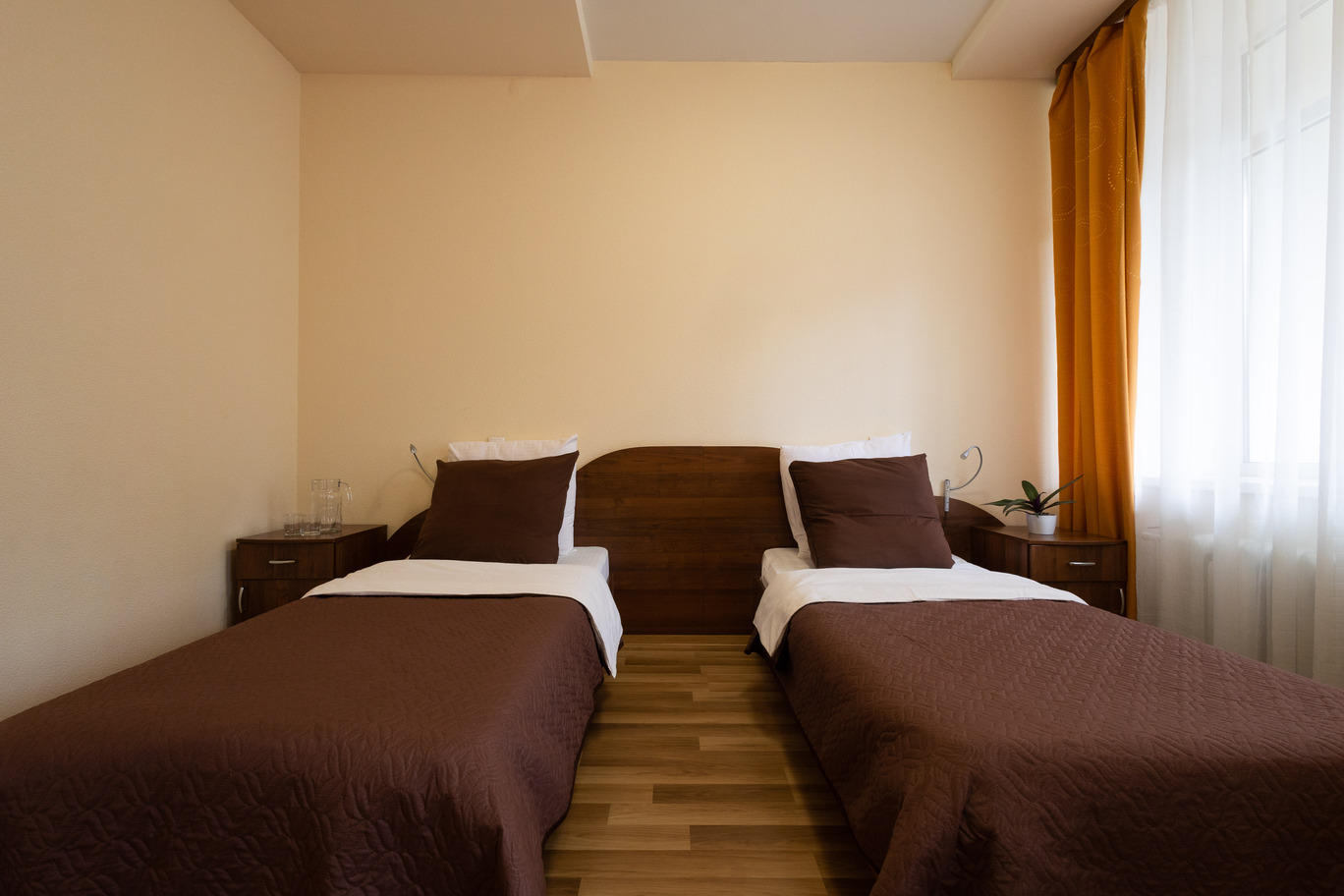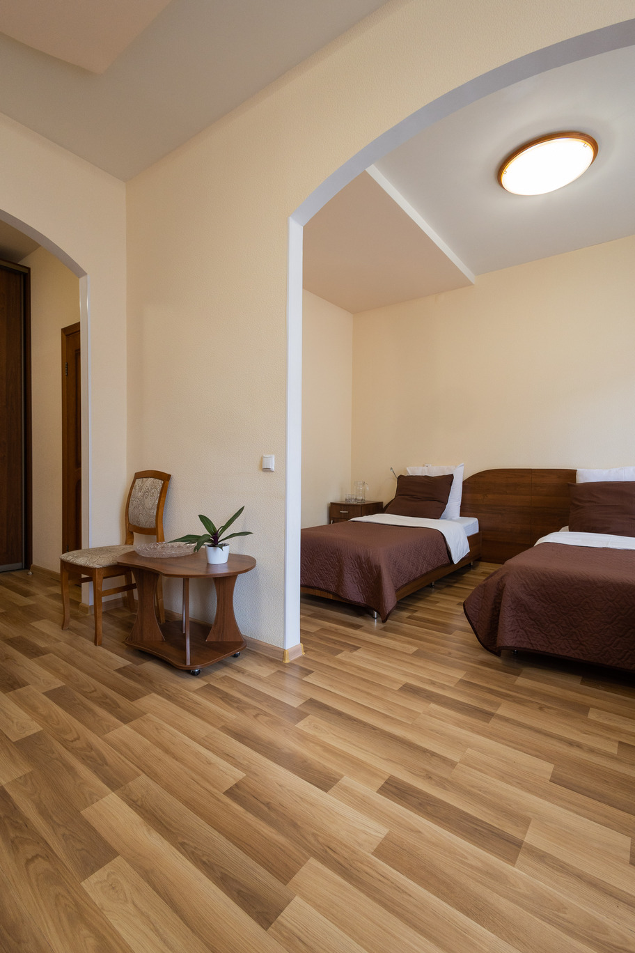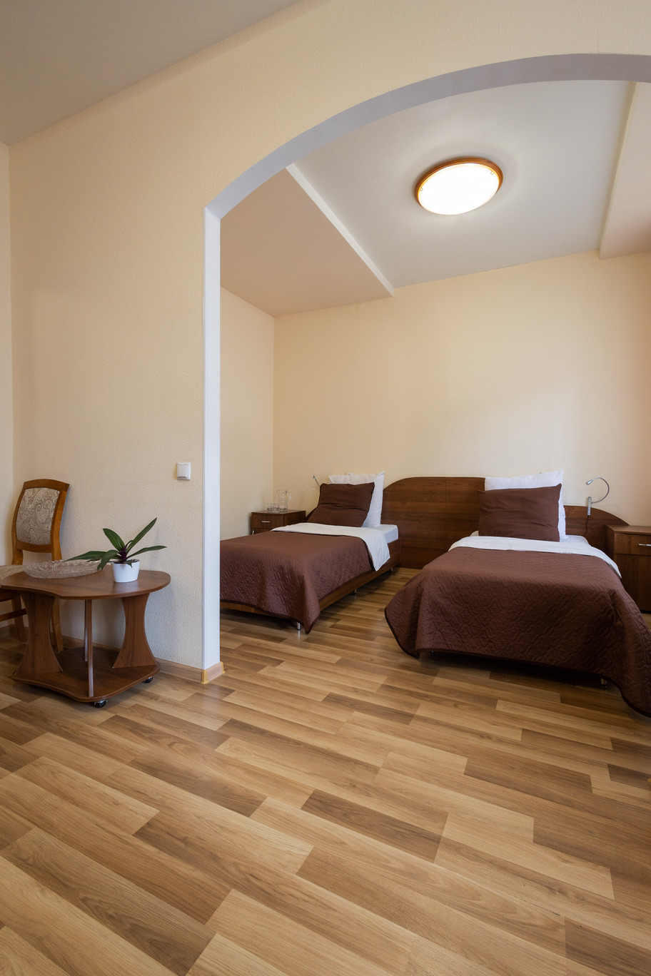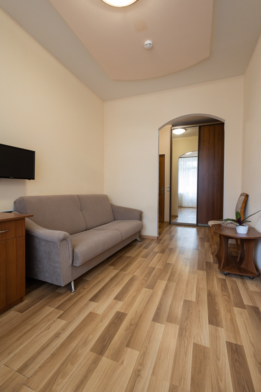 Уютный однокомнатный номер, состоящий из небольшой прихожей, гостиной и спальной комнаты. В номере удобная мебель, 2 кровати.