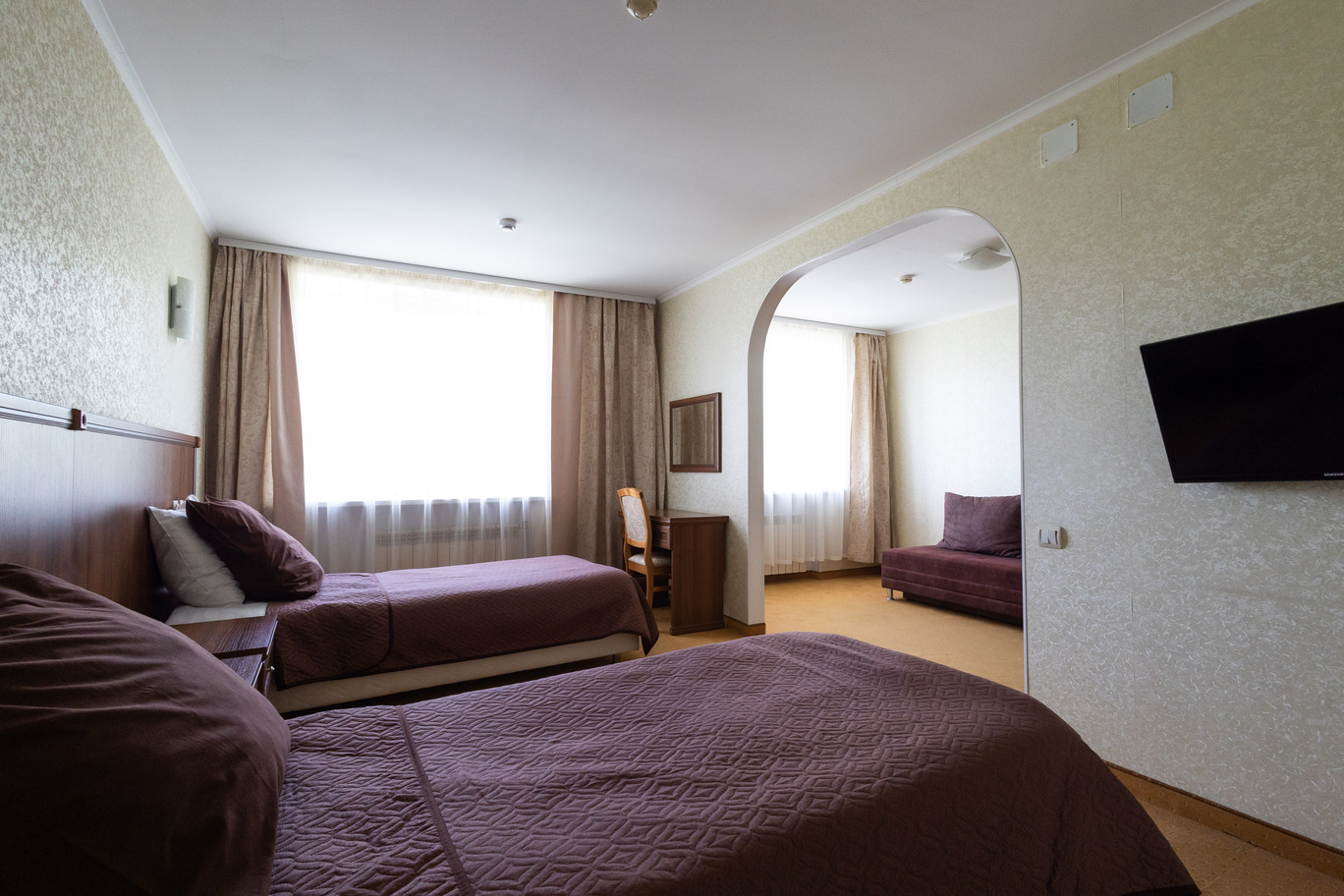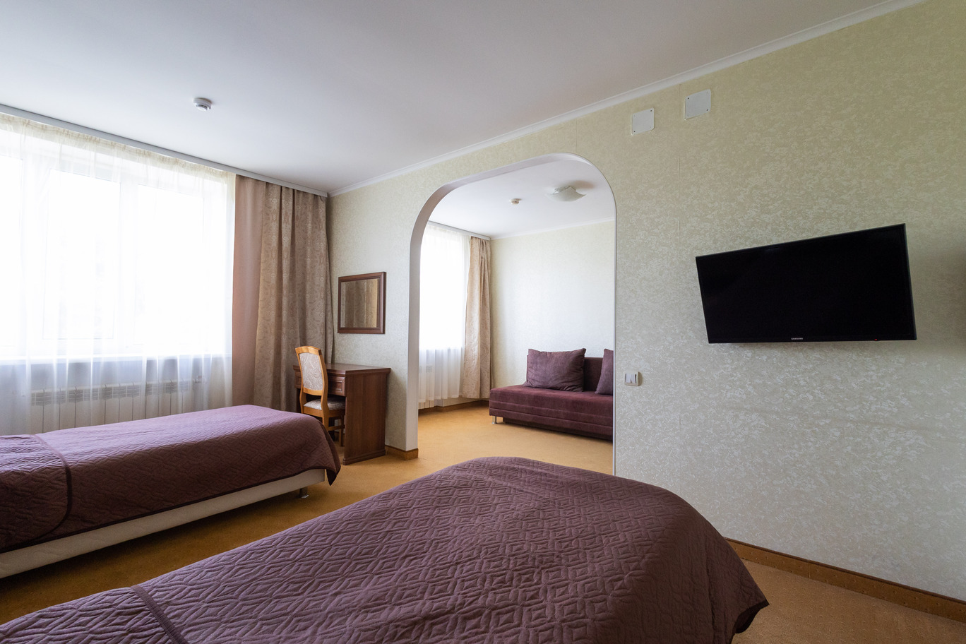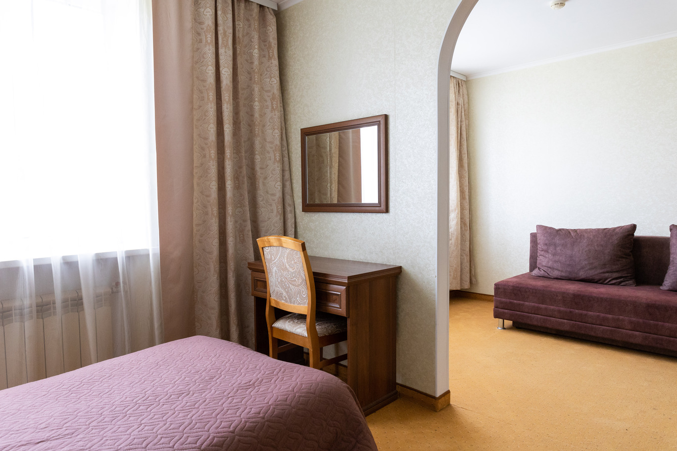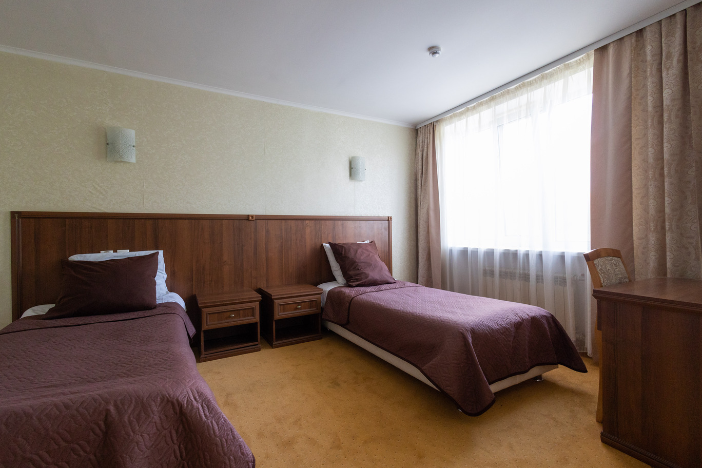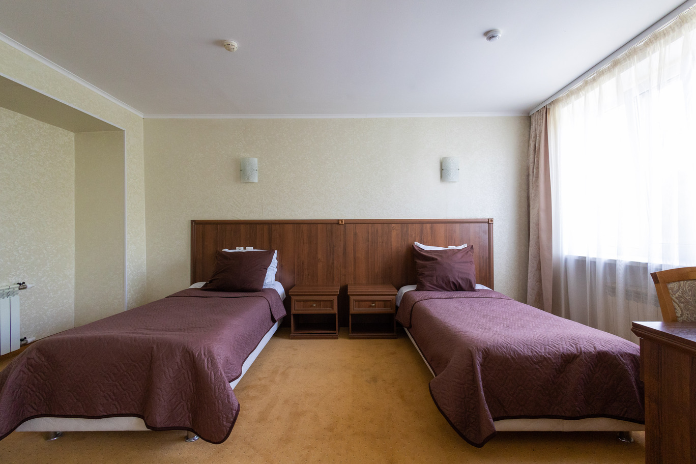 Уютные однокомнатные номера, состоящие из небольшой прихожей и спальной комнаты. В номерах удобная мебель, 2 кровати.